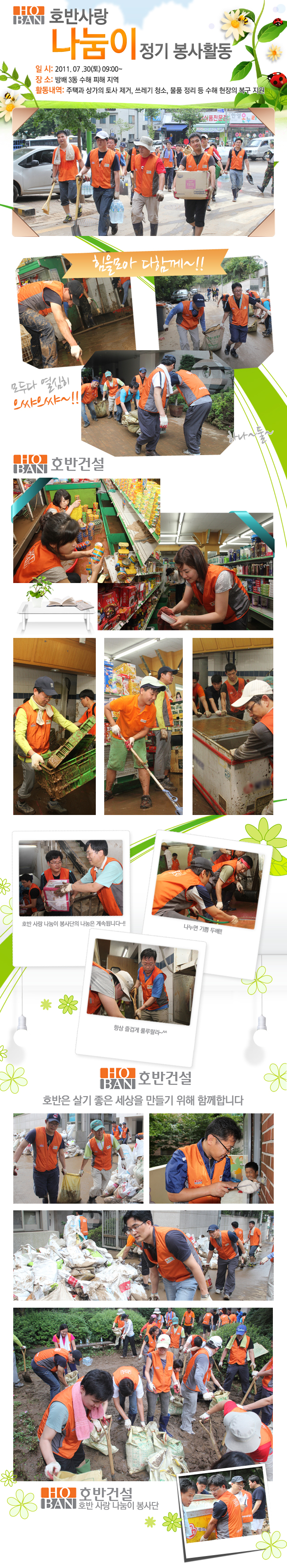 호반사랑나눔이 정기봉사활동일시 : 2011.07.30(토) 09:00~장소 : 방배 3동 수해 피해 지역활동내역 : 주택과 상가의 토사 제거, 쓰레기 청소, 물품 정리 등 수해 현장의 복구 지원힘을모아 다함께~!!모두다 열심히 으쌰으쌰~!! 하나~ 둘~호반 사랑 나눔이 봉사단의 나눔은 계속됩니다~!!나누면 기쁨 두배!!항상 즐겁게 룰루랄라~^^호반은 살기 좋은 세상을 만들기 위해 함께합니다