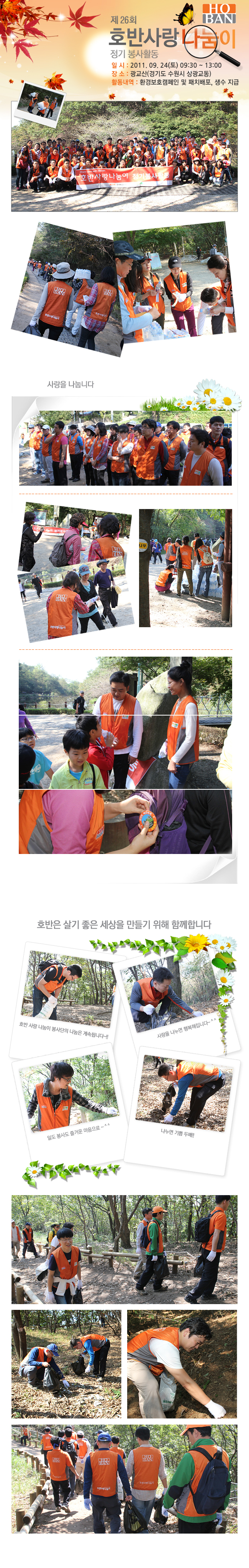 호반사랑나눔이행사명 : 제 26회 호반사랑나눔이 정기봉사활동일시 : 2011.09.24(토) 09:30~13:00장소 : 광교산(경기도 수원시 상광교동)활동내역 : 환경보호캠페인 및 패치배포, 생수지급호반 사랑 나눔이 봉사단의 나눔은 계속됩니다~!!사랑을 나누면 행복해집니다~^^일도 봉사도 즐거운 마음으로~^^나누면 기쁨 두배!