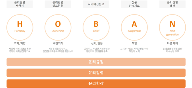 기업의 법적. 경제적 책임 수행은 물론이고, 사회 통념적으로 기대되는 윤리적 책임의 수행까지 기본적 의무로 인정하고 기업윤리 준수를 행동원칙으로 삼는 경영입니다. 이는 기업의 이해관계자로부터 지속적인 신뢰와 자율성을 보장 받기 위한 전제조건입니다.