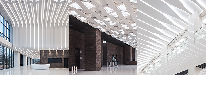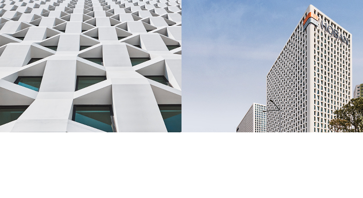 빛과 그림자에 따라 시시각각 변화하는 건물의 입면에서 혁신적이고 변화하는 기업의 정체성은 물론 보행자나 차량이동의 관점에서도