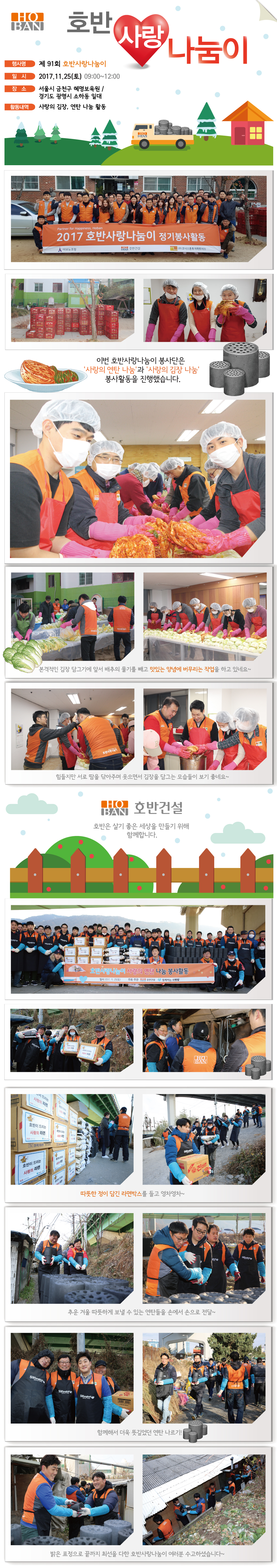 이번 호반사랑나눔이 봉사단은 ‘사랑의 연탄 나눔’ 과 ‘사랑의 김장 나눔’ 봉사활동을 진행했습니다.