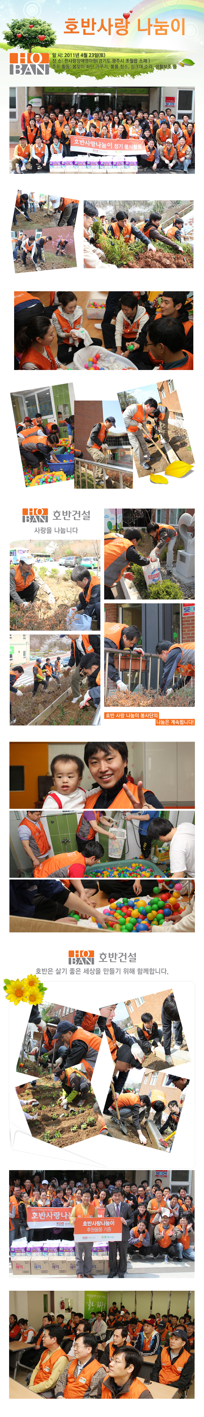 호반사랑나눔이 정기봉사활동일시 : 2011.04.23(토)장소 : 한사랑장애영아원(경기도 광주시 초월읍 소재)주요 활동 : 봄맞이 화단 가꾸기, 볼 풀 청소, 싱크대 수리, 생활보조 등사랑을 나눕니다호반 사랑 나눔이 봉사단의 나눔은 계속됩니다~!!호반은 살기 좋은 세상을 만들기 위해 함께합니다