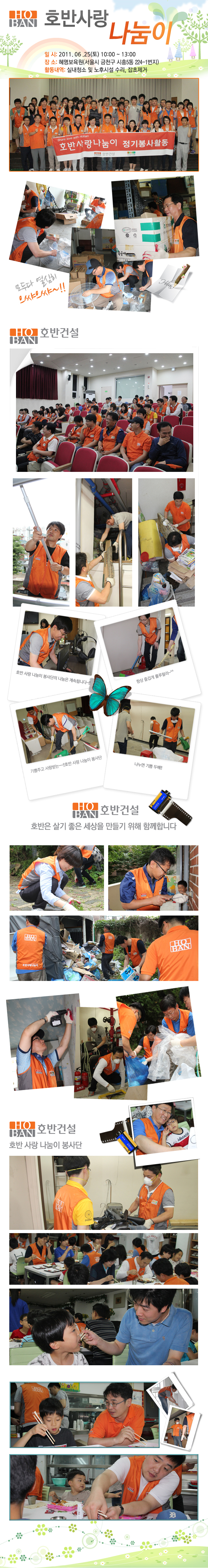 호반사랑나눔이 정기봉사활동일시 : 2011.06.25(토) 10:00~13:00장소 : 혜명보육원(서울시 금천구 시흥5동 224-1번지)활동내역 : 실내청소 및 노후시설 수리, 잡초제거모두다 열심히 으쌰으쌰~!! 호반 사랑 나눔이 봉사단의 나눔은 계속됩니다~!!항상 즐겁게 룰루랄라~^^기쁨주고 사랑받는~~!! 호반 사랑 나눔이 봉사단나누면 기쁨 두배!!호반은 살기 좋은 세상을 만들기 위해 함께합니다